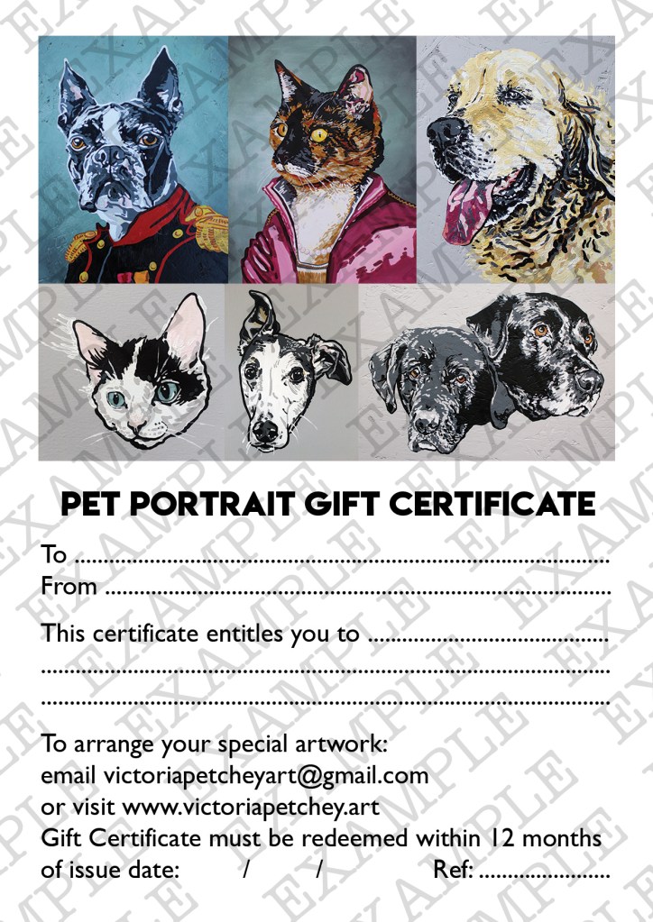 - ‘Pet Portrait’ – x1 Portrait of x1 animal, 12 x 12 inch or 14 x 11 inch box canvas, full colour, one choice of background colour = £115 including personalised Gift Certificate and envelope,postage additional cost to be agreed at time of purchase if needed.